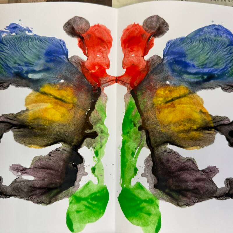 Male mit dem Pinsel Striche, Flecken, Formen auf die eine Hälfte des Papiers, klappe das Papier zusammen und streiche es mit der Handfläche glatt, öffne es wieder und lass dich vom zauberhaften Ergebnis überraschen.